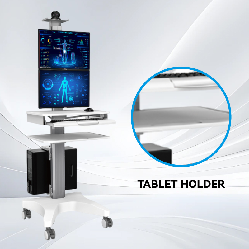 Die Tastaturablage ist eine kompakte und ergonomische, ausziehbare Ablage, die in den medizinischen Wagen integriert ist. Sie bietet sicheren und stabilen Stauraum für eine Computertastatur, lässt sich problemlos in eine bequeme Schreibposition ausfahren und bei Nichtgebrauch nahtlos einfahren. Dieses platzsparende Design gewährleistet einen sauberen, übersichtlichen Arbeitsablauf und schützt die Tastatur beim Bewegen des Wagens.
