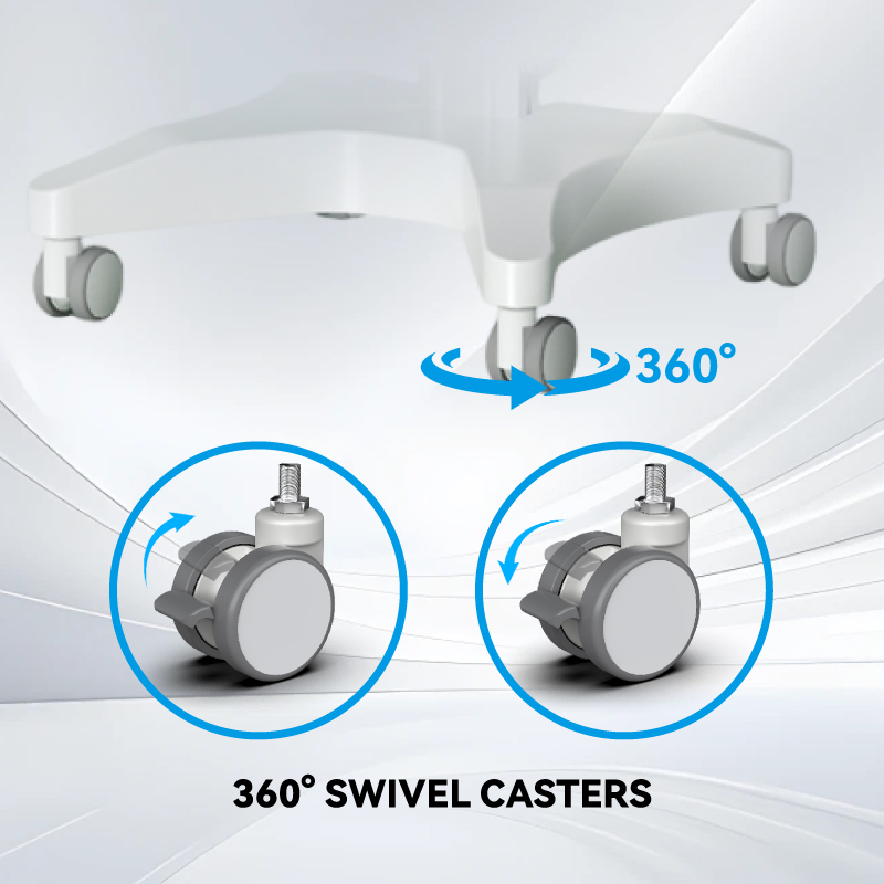 Der Likaymo Laptopwagen ist mit vier 3-Zoll-Rädern mit 360°-Schwenkfunktion und fußbetätigten Bremsen ausgestattet, die für reibungslose Mobilität und sicheren Stand sorgen. Die großen Räder überwinden problemlos Schwellen und Teppichübergänge und ermöglichen so müheloses Manövrieren auf verschiedenen Bodenarten in Kliniken, Krankenhäusern oder Salons. Dank des robusten Rahmens bleibt der Wagen während des Gebrauchs stabil, und die Feststellräder sorgen für einen festen Stand im Stand.