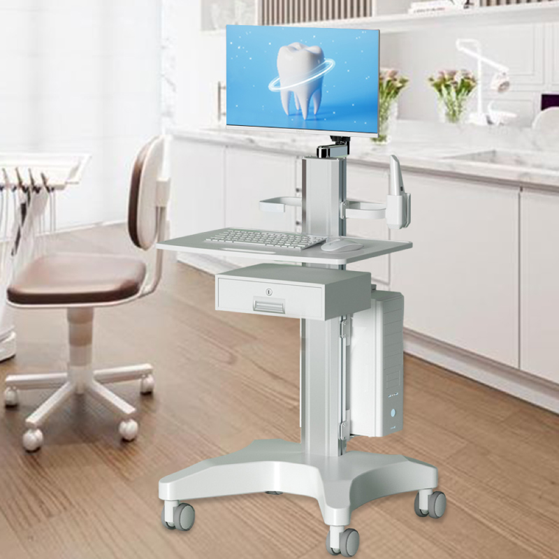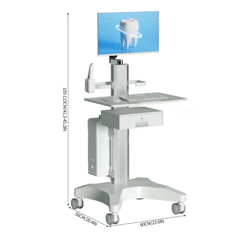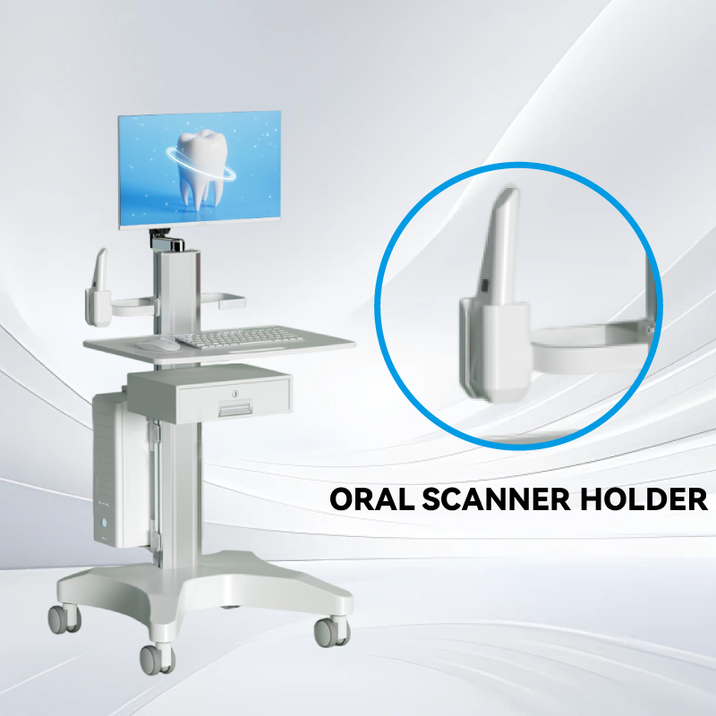 Dieser All-in-One-Dentalwagen integriert eine PC-Workstation, einen verstellbaren Monitor für 3D-Scans und eine sichere Halterung für den Oralscanner. Er verfügt über eine ausziehbare Tastaturablage und eine abschließbare Schublade für eine übersichtliche Aufbewahrung und gewährleistet so effiziente, mobile klinische Arbeitsabläufe.
