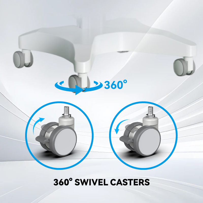 TDiese Hochleistungsrollen ermöglichen eine reibungslose, multidirektionale Mobilität und ermöglichen so eine einfache Positionierung der Geräte. Ein einfacher Rastmechanismus fixiert die Räder fest an ihrem Platz und sorgt für absolute Stabilität während der Behandlung. Ideal für medizinische und zahnmedizinische Wagen, die sowohl mühelose Bewegung als auch sichere Verriegelung erfordern.