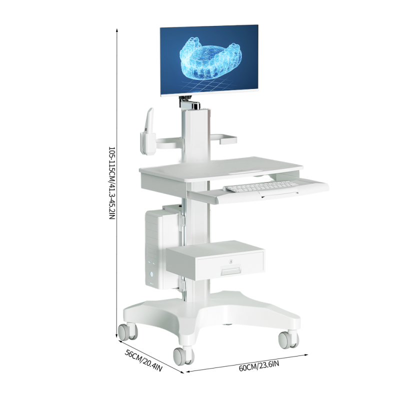 Medizinischer Wagen mit abschließbaren Schubladen, einstellbarer Höhe und einem pneumatischen Arm, der freie Bewegung mit Drehung in alle Richtungen ermöglicht, komplett mit einem Halter für einen Intraoralscanner.