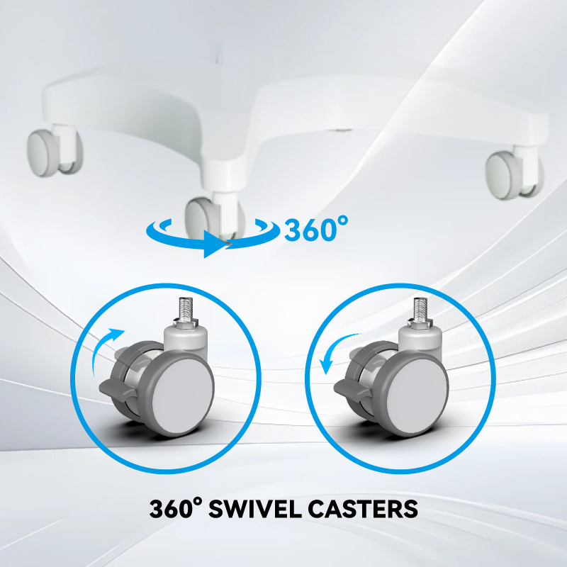 Der Likaymo Laptopwagen ist mit vier 3-Zoll-Rädern mit 360°-Schwenkfunktion und fußbetätigten Bremsen ausgestattet, die für reibungslose Mobilität und sicheren Stand sorgen. Die großen Räder überwinden problemlos Schwellen und Teppichübergänge und ermöglichen so müheloses Manövrieren auf verschiedenen Bodenarten in Kliniken, Krankenhäusern oder Salons. Dank des robusten Rahmens bleibt der Wagen während des Gebrauchs stabil, und die Feststellräder sorgen für einen festen Stand im Stand.