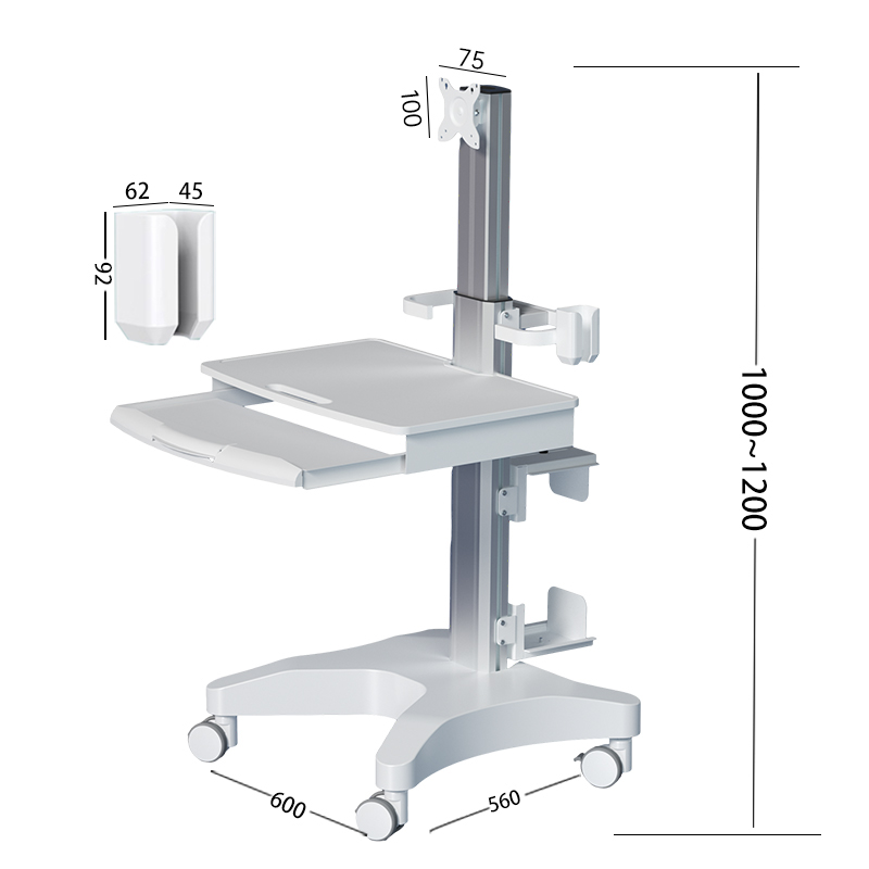 Dies ist ein moderner mobiler medizinischer Wagen mit einem großen verstellbaren Monitor, einer ausziehbaren Tastaturablage und einer speziellen Halterung für einen Handscanner.
