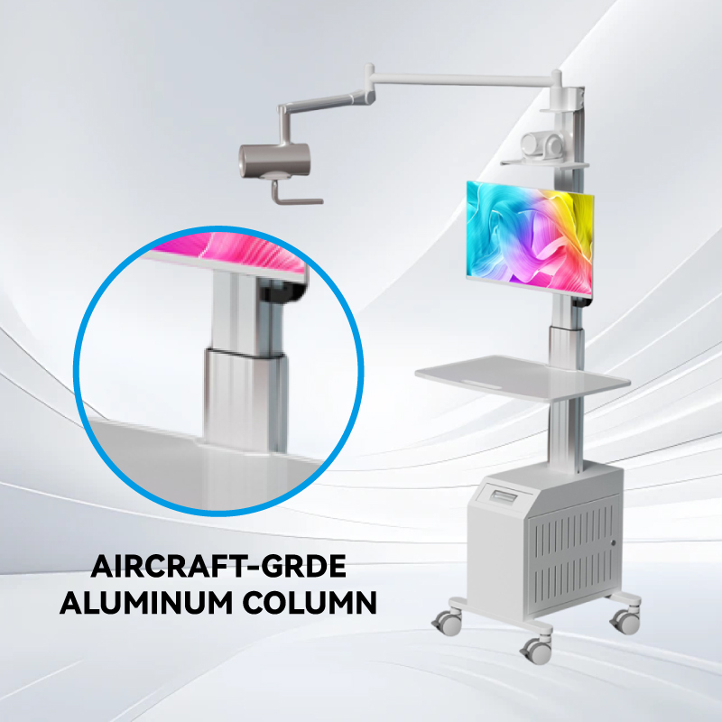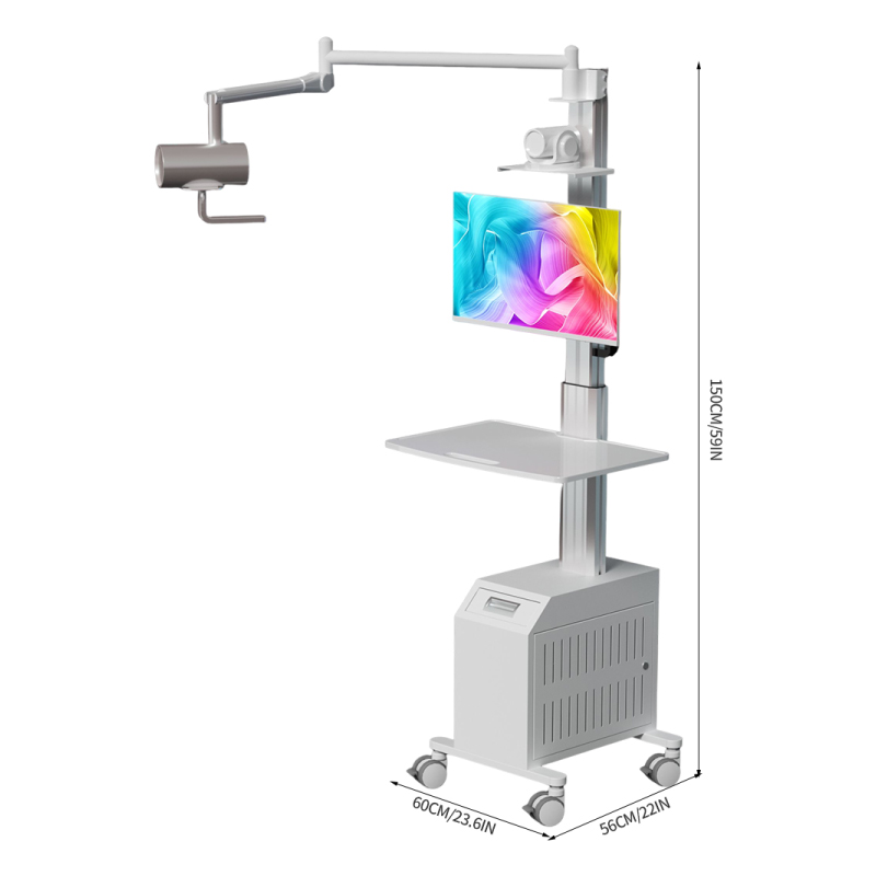 Ein höhenverstellbarer medizinischer Wagen mit einem pneumatischen Arm, der freie Bewegung und Drehung in alle Richtungen ermöglicht und mit einer Halterung für einen Intraoralscanner ausgestattet ist.