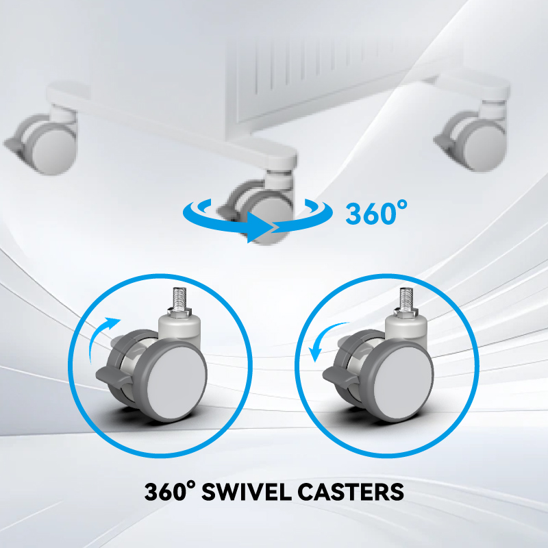 Der Likaymo Laptopwagen ist mit vier 3-Zoll-Rädern mit 360°-Schwenkfunktion und fußbetätigten Bremsen ausgestattet, die für reibungslose Mobilität und sicheren Stand sorgen. Die großen Räder überwinden problemlos Schwellen und Teppichübergänge und ermöglichen so müheloses Manövrieren auf verschiedenen Bodenarten in Kliniken, Krankenhäusern oder Salons. Dank des robusten Rahmens bleibt der Wagen während des Gebrauchs stabil, und die Feststellräder sorgen für einen festen Stand im Stand.