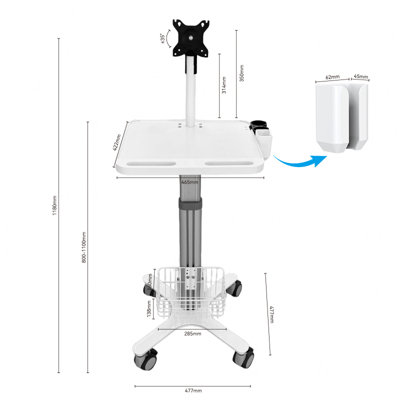 Der großzügige Arbeitstisch (465 × 422 mm) trägt bis zu 30 kg und bietet sicheren Halt für mehrere Geräte wie Monitore, Tastaturen, Mäuse und Intraoralscanner. Die absturzsichere Kante und die Kabeldurchführungen sorgen für Ordnung und einen aufgeräumten mobilen Arbeitsbereich für Diagnose und Behandlung.